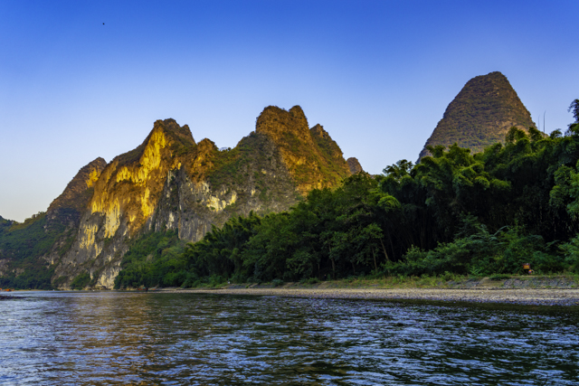 ふてくされ気味に山を降りて車に戻った。興坪までの船着き場に戻る途中、ちょうど見晴らしの良い所で太陽が出てきた。僕の不機嫌さを察したのか、そこで止まってくれたので、思いがけず良い写真を撮ることができた。
